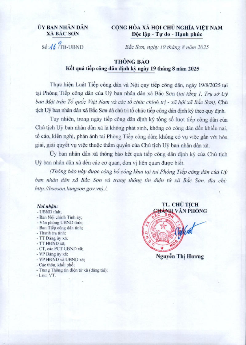 Tiêu đề văn bản | Thông báo kết quả tiếp công dân định kỳ ngày 19/8/2025 | ||