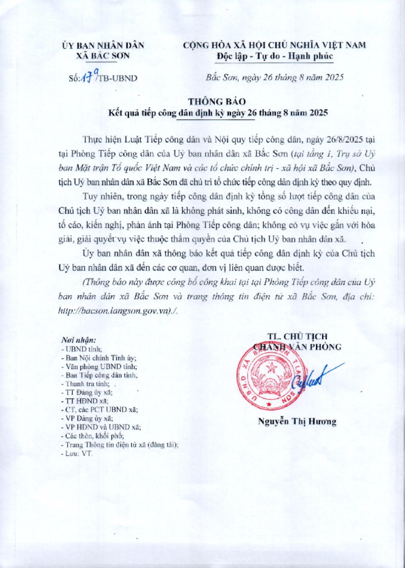 Tiêu đề văn bản | Thông báo kết quả tiếp công dân định kỳ ngày 26/8/2025 | ||