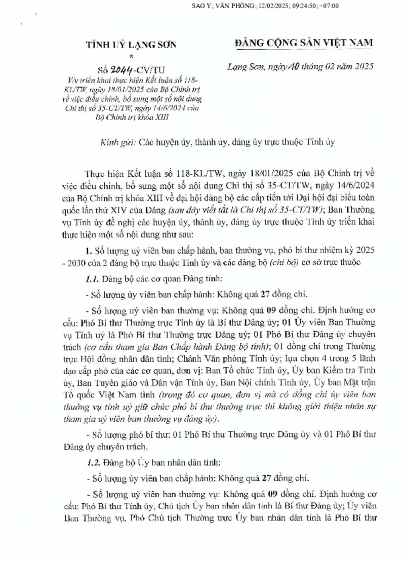 | Tiêu đề văn bản | Công văn của Ban Thường vụ Tỉnh ủy về việc triển khai thực hiện Kết luận số 118-KL/TW, ngày 18/01/2025 của Bộ Chính trị về việc điều chỉnh, bổ sung một số nội dung Chỉ thị số 35-CT/TW, ngày 14/6/2024 của Bộ Chính trị khóa XIII | ||