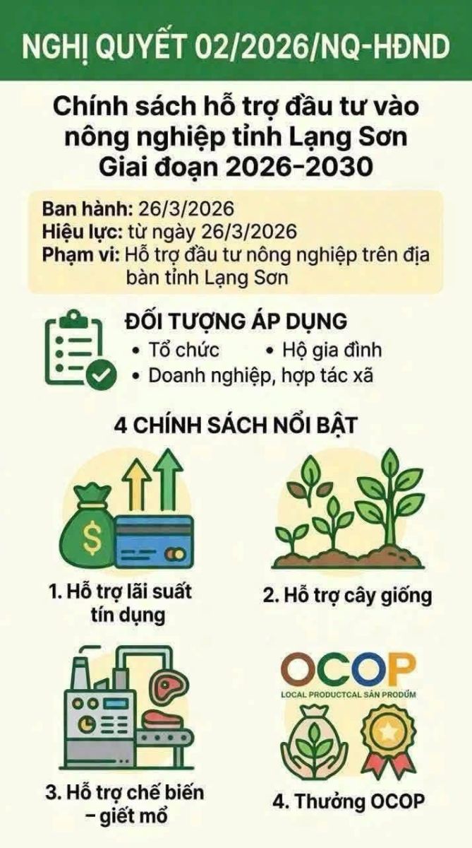 Ngày 26/3/2026, Hội đồng nhân dân tỉnh Lạng Sơn đã ban hành Nghị quyết số 02/2026/NQ-HĐND về chính sách hỗ trợ đầu tư vào nông nghiệp trên địa bàn tỉnh giai đoạn 2026–2030. Đây là chủ trương quan trọng nhằm thúc đẩy phát triển nông nghiệp theo hướng hiện đại, nâng cao giá trị gia tăng, tạo động lực thu hút các tổ chức, cá nhân và doanh nghiệp tham gia đầu tư, sản xuất, kinh doanh trong lĩnh vực nông nghiệp.