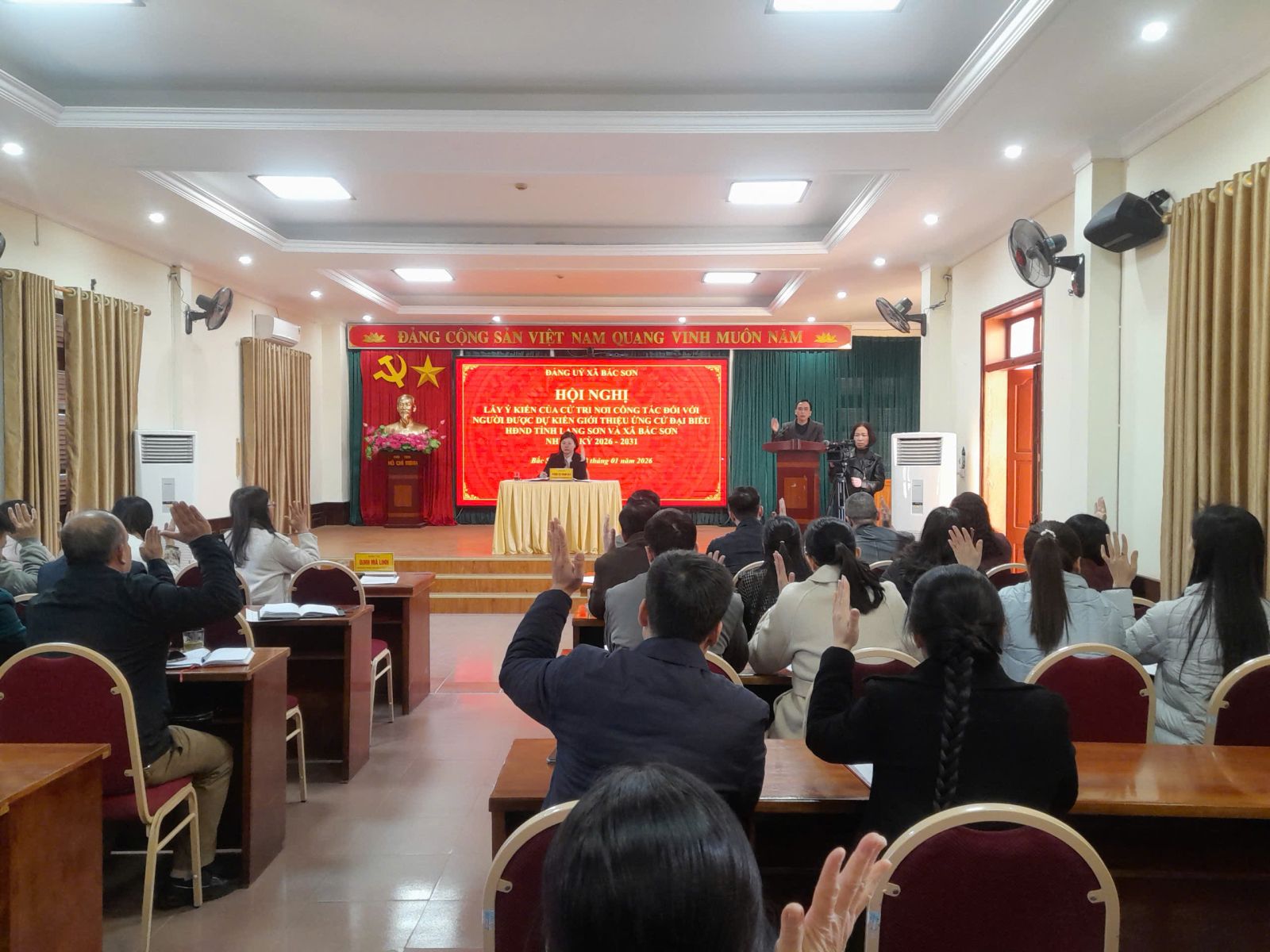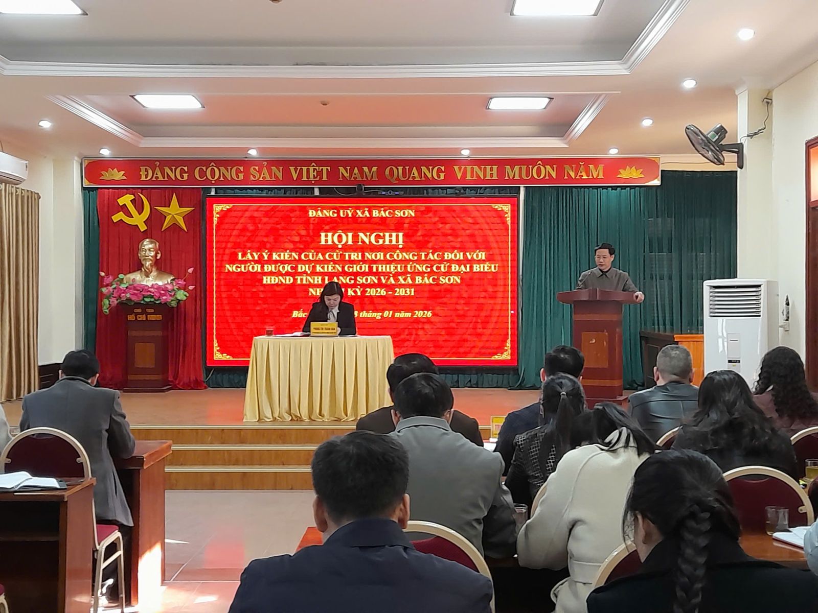 Thực hiện quy trình hiệp thương trong công tác bầu cử đại biểu Hội đồng nhân dân các cấp nhiệm kỳ 2026 – 2031, ngày 08/01/2026, Đảng ủy xã Bắc Sơn tổ chức Hội nghị lấy ý kiến cử tri nơi công tác đối với người được dự kiến giới thiệu ứng cử đại biểu HĐND tỉnh và HĐND xã. Tham dự và chỉ đạo Hội nghị có đồng chí Lương Tiến Trình, Phó Chủ tịch Ủy ban MTTQ Việt Nam tỉnh kiêm trưởng Ban Tuyên giáo và công tác xã hội; đầy đủ các đồng chí Thường trực Đảng ủy xã, lãnh đạo HĐND, UBND, Ủy ban MTTQ xã và cán bộ, công chức, viên chức xã Bắc Sơn.