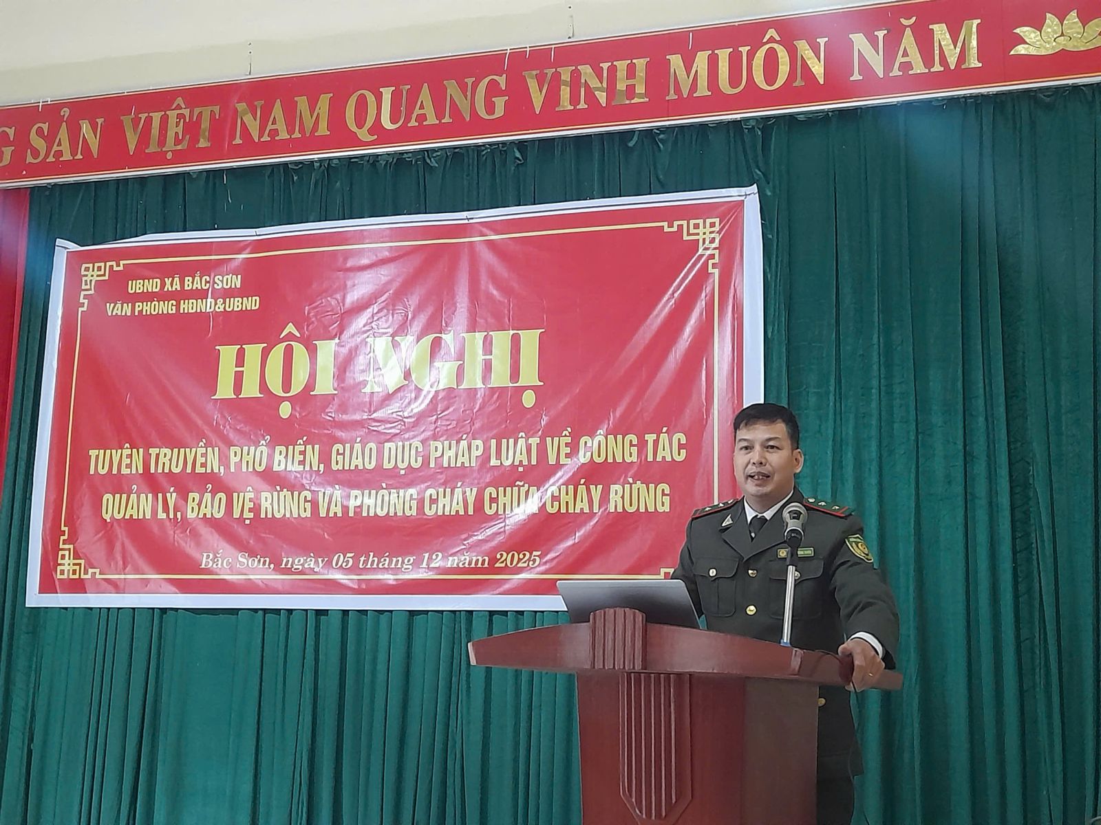 Thực hiện Luật Phổ biến giáo dục pháp luật năm 2012. Kế hoạch số 68/KH-UBND ngày 30/10/2025 của UBND xã Bắc Sơn, sáng ngày 05 tháng 12 năm 2025, tại Nhà Văn hóa thôn Bản Thí, xã Bắc Sơn, Văn phòng HĐND&UBND xã Bắc Sơn đã tổ chức Hội nghị tuyên truyền, phổ biến, giáo dục pháp luật về công tác quản lý bảo vệ rừng và phòng cháy chữa cháy rừng.