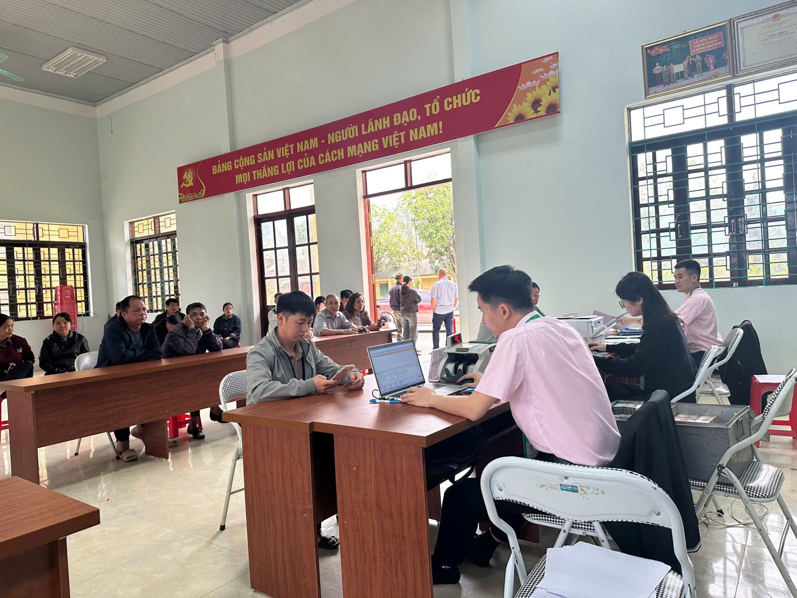 ( Ngân hàng CSXH đang thực hiện giải ngân tại điểm giao dịch Bắc Quỳnh)