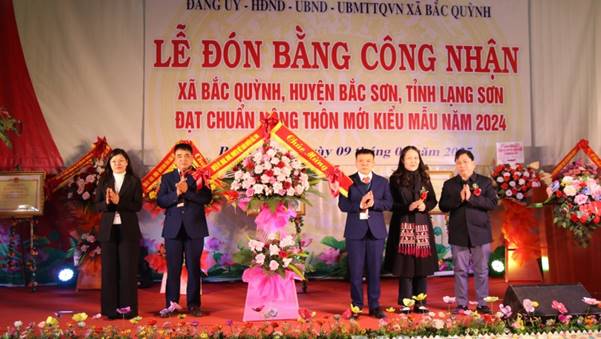 Được sự ủy quyền của UBND tỉnh, đồng chí Nguyễn Hữu Chiến, Ủy viên Ban Chấp hành Đảng bộ tỉnh, Giám đốc Sở Nông nghiệp và Phát triển nông thôn, Chánh văn phòng điều phối XDNTM tỉnh Lạng Sơn đã trao bằng công nhận xã Bắc Quỳnh đạt chuẩn nông thôn mới kiểu mẫu về lĩnh vực Du lịch mang giá trị đặc trưng của địa phương năm 2024 cho đảng bộ, chính quyền và nhân dân xã Bắc Quỳnh. Nhân dịp này đồng chí Phùng thị Thanh Nga, Phó bí thư Huyện uỷ, Chủ tịch UBND huyện đã tặng hoa chúc mừng xã được công nhận đạt chuẩn nông thôn mới kiểu mẫu.
