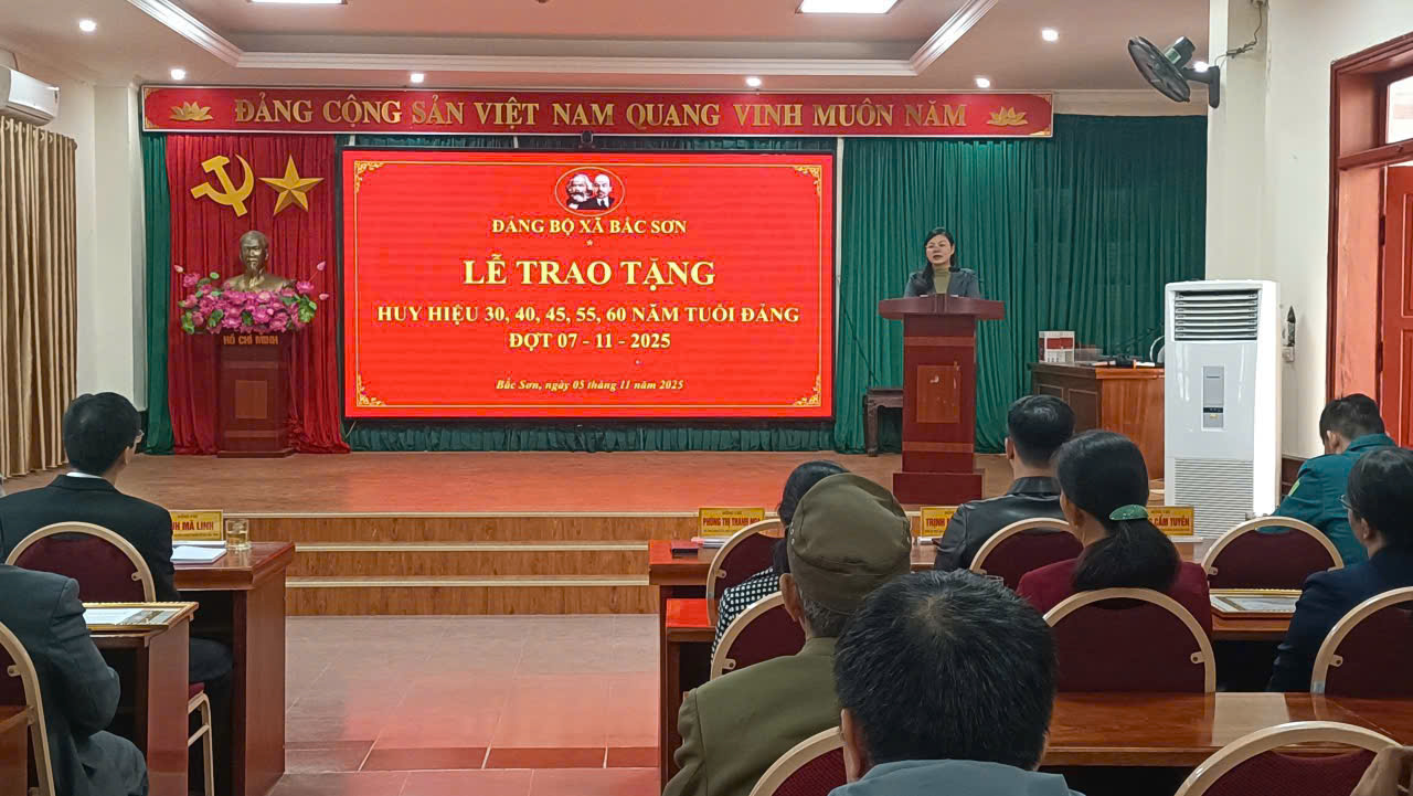 Thực hiện Quyết định số 18-QĐ/TU ngày 21/10/2025 của Ban Thường vụ Tỉnh ủy Lạng Sơn về tặng Huy hiệu Đảng, Đảng bộ xã Bắc Sơn có nhiều đồng chí được trao tặng Huy hiệu 30 năm, 40 năm, 45 năm, 55 năm và 60 năm tuổi Đảng. Đây là phần thưởng cao quý của Đảng, ghi nhận quá trình cống hiến, rèn luyện, giữ vững bản lĩnh chính trị, phẩm chất đạo đức, lối sống gương mẫu và tinh thần tiên phong của các đảng viên qua nhiều thời kỳ.